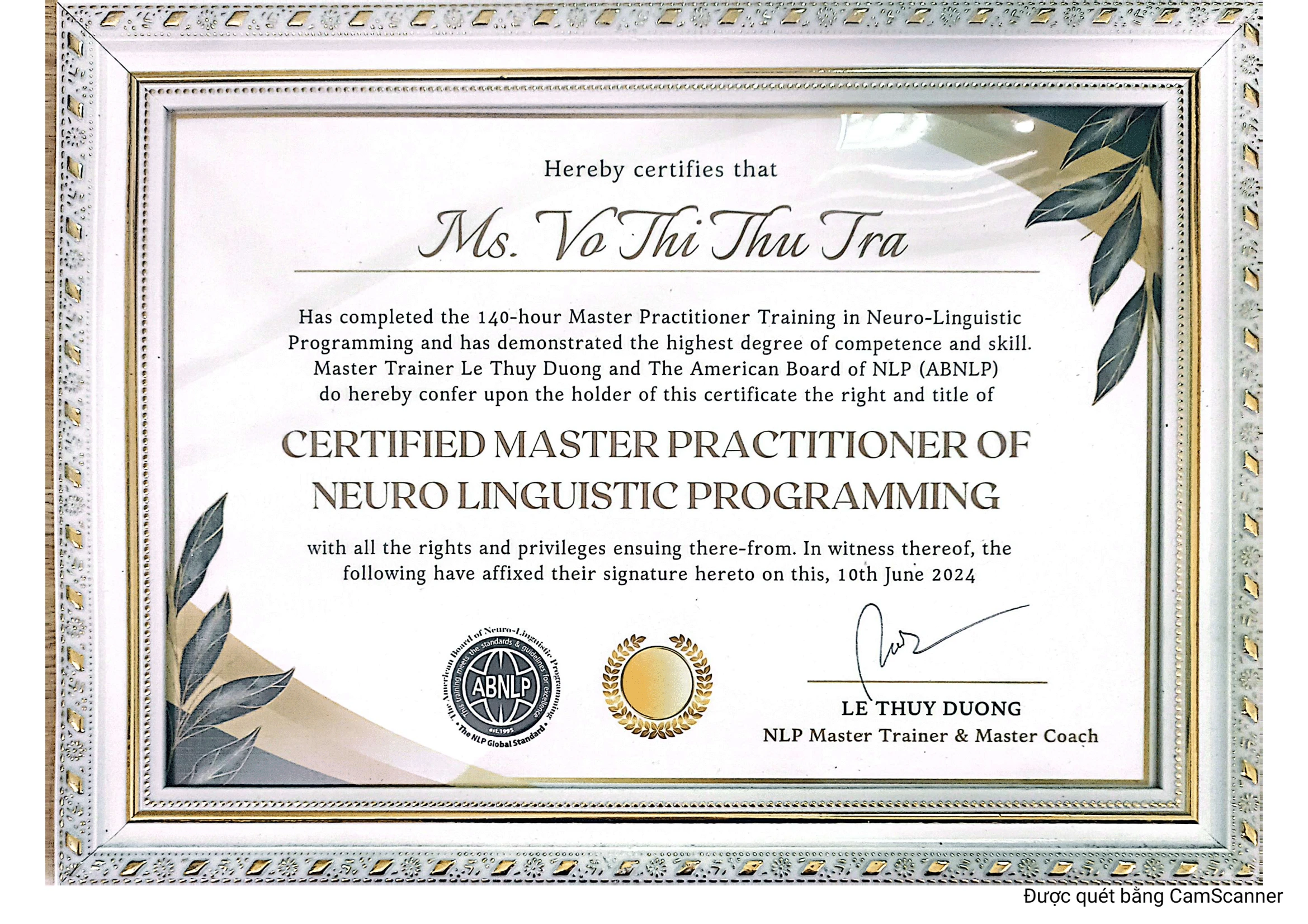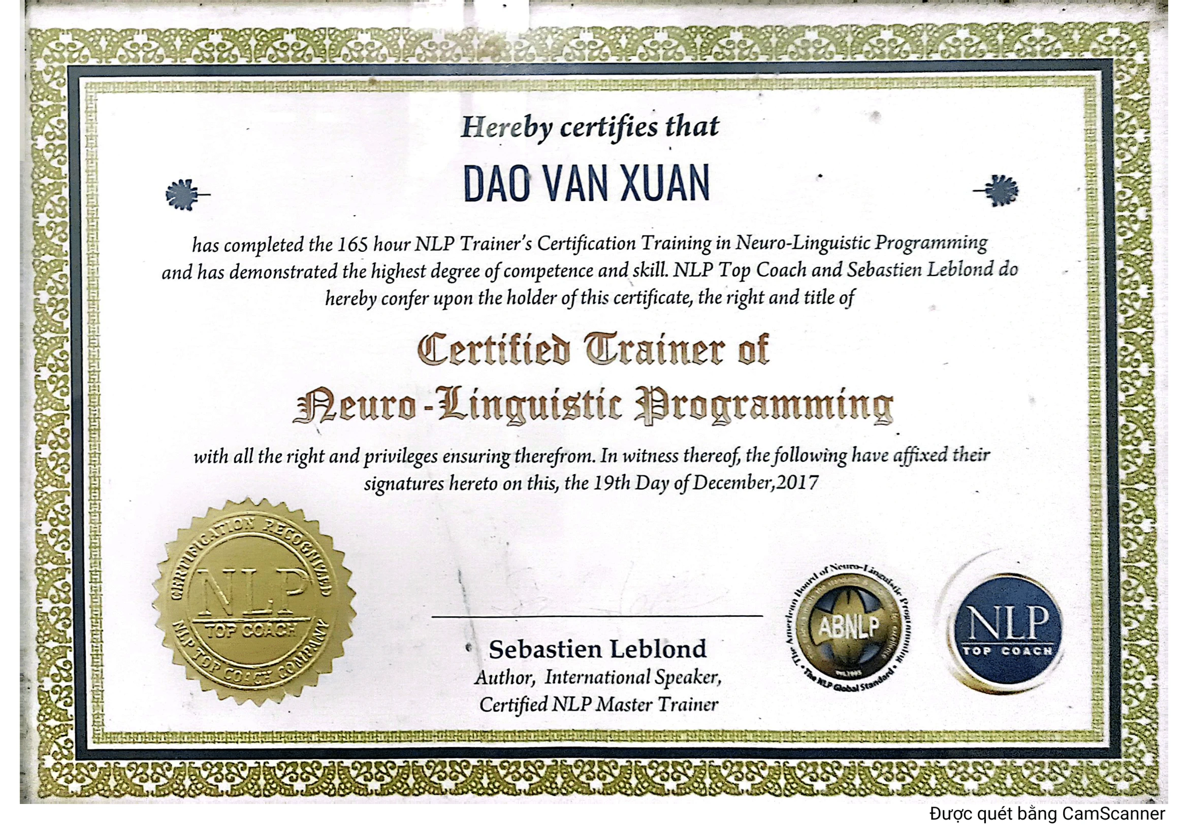 • Chứng nhận Trainer NLP quốc tế (ABNLP Hoa Kỳ)