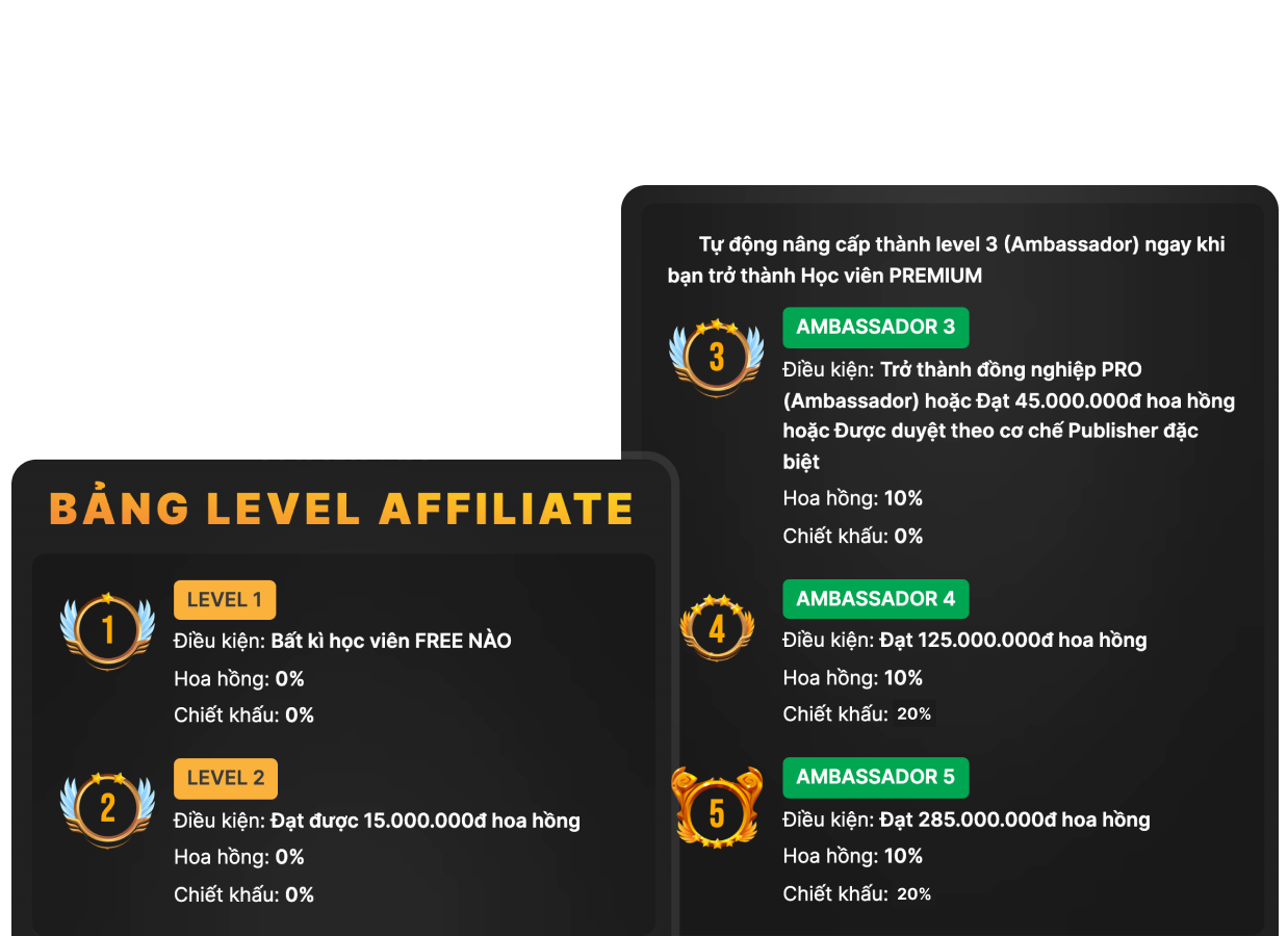 - Được tham gia chương trình Affiliate độc quyền, nhận hoa hồng từ 10% đến 35% cho mỗi học viên bạn giới thiệu thành công.